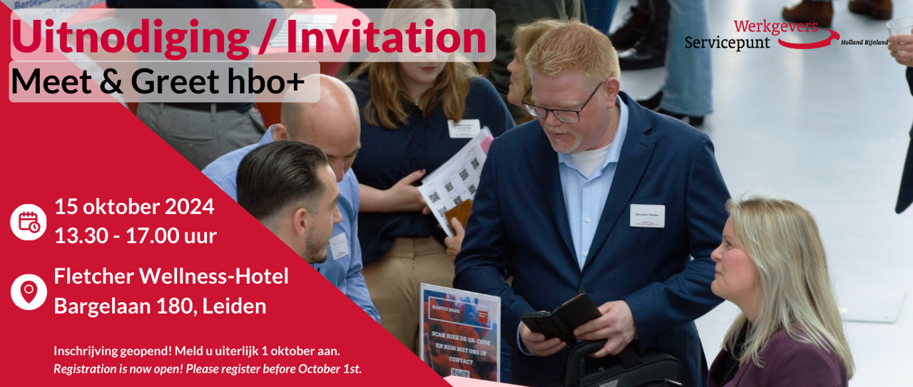 Wij nodigen u van harte uit voor een nieuwe editie van de succesvolle Meet & Greet hbo+ op dinsdag 15 oktober 2024. Bent u op zoek naar personeel dat hbo of hoger geschoold is? Komt u graag in contact met potentieel nieuwe medewerkers? Op deze netwerkbijeenkomst kunt u werkzoekenden ontmoeten die op zoek zijn naar een volgende stap in hun carrière. Mis deze kans niet om hen te ontmoeten, waardevolle connecties te leggen én uw vacatures in te vullen. Schrijf u uiterlijk 1 oktober in via onderstaande button.